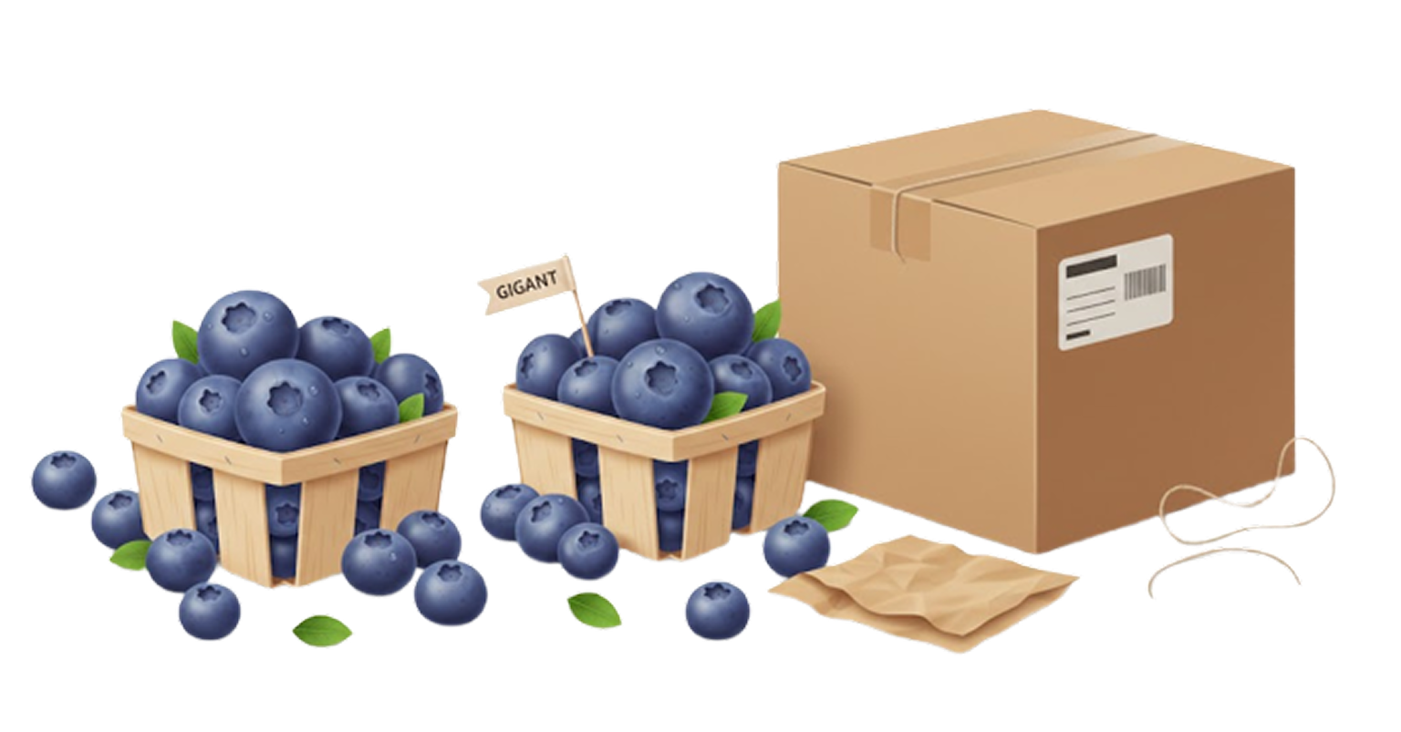 «Blue Giant» — современный высокоурожайный сорт голубики родом из Австралии. Обладает очень крупными, плотными и сладкими ягодами. Ягоды ароматные, с приятным балансом сладости и лёгкой кислинки. Отлично хранятся и хорошо переносят транспортировку.